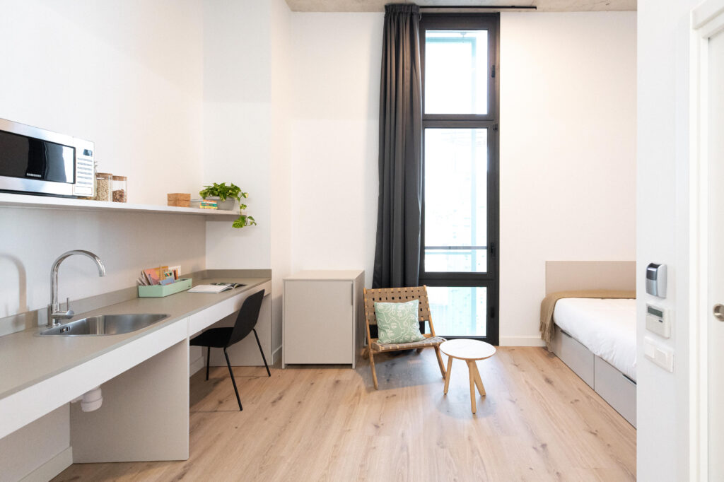 The residence features 232 fully furnished single rooms, each equipped with a private bathroom, kitchen, air conditioning, and high-speed Wi-Fi. Room options include basic single rooms, rooms with balconies, and premium rooms with terraces. Full and half-board catering options are available, and rooms are cleaned biweekly.