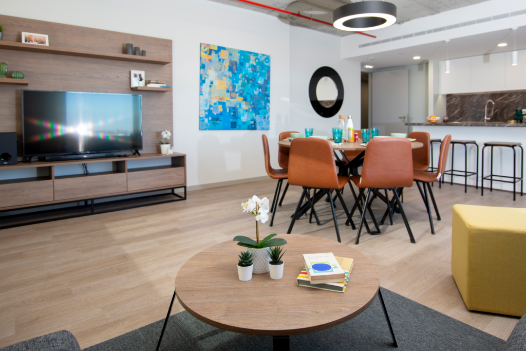 Building facilities and amenities include, high-speed WiFi, 24-hour reception service, study rooms, cafeteria and living room, swimming pool, terrace and gym.