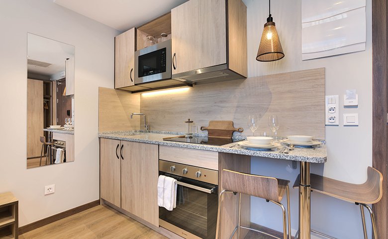 All our rooms are equipped with everything you need to enjoy an unforgettable experience: private bathroom, full kitchen (sink, oven, microwave, fridge with freezer, induction hobs and extractor hood), air conditioning, Smart TV and 30 Mb Wifi.