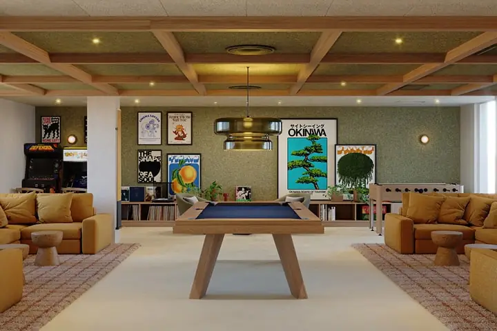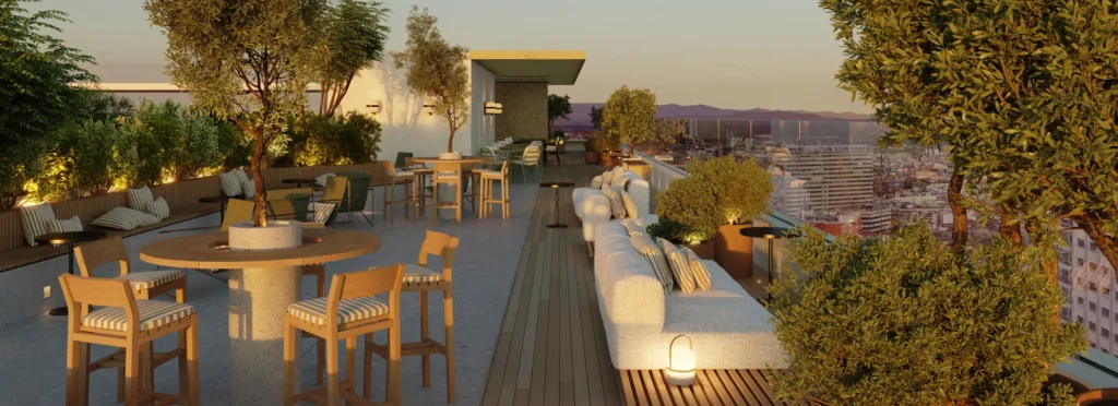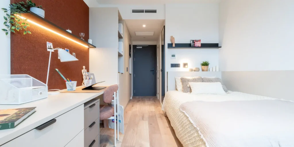 This newly built residence offers a wide range of accommodation options, including studios with private kitchens and en-suite rooms with shared kitchen access. All rooms are fully furnished with a private bathroom, double bed, study area, ample storage, and either a fridge and microwave or a fully equipped kitchen. Common areas include a state-of-the-art gym, yoga and spinning studio, rooftop swimming pool, cinema room, shared study spaces, bicycle parking, and a rooftop terrace with panoramic views.
