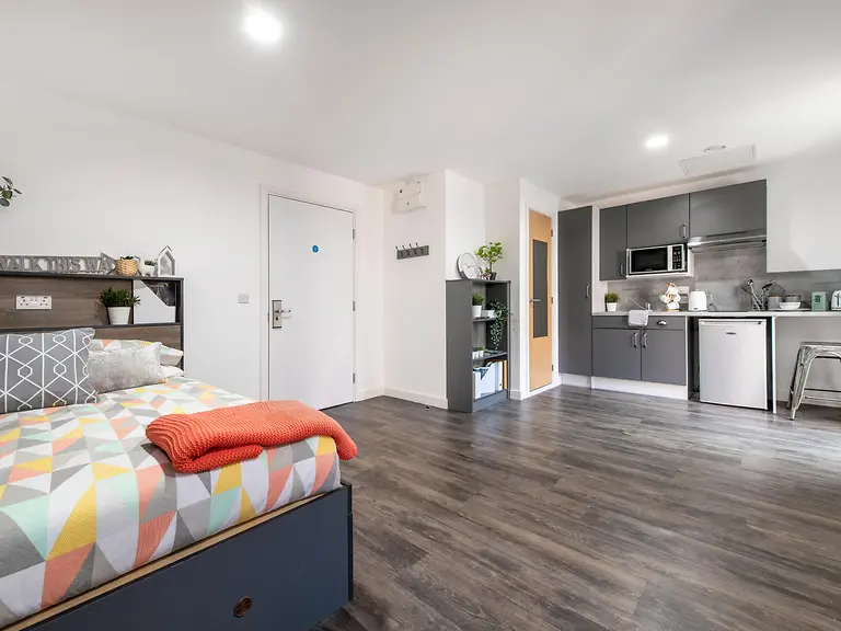 Each room features a small double bed, private bathroom, study space, and generous storage. Cluster flats include shared kitchens and lounges with Smart TVs, while studios offer private kitchenettes for independent living. On-site amenities include a gym, games room, study areas, and a spacious common room—perfect for both quiet revision and lively socializing.